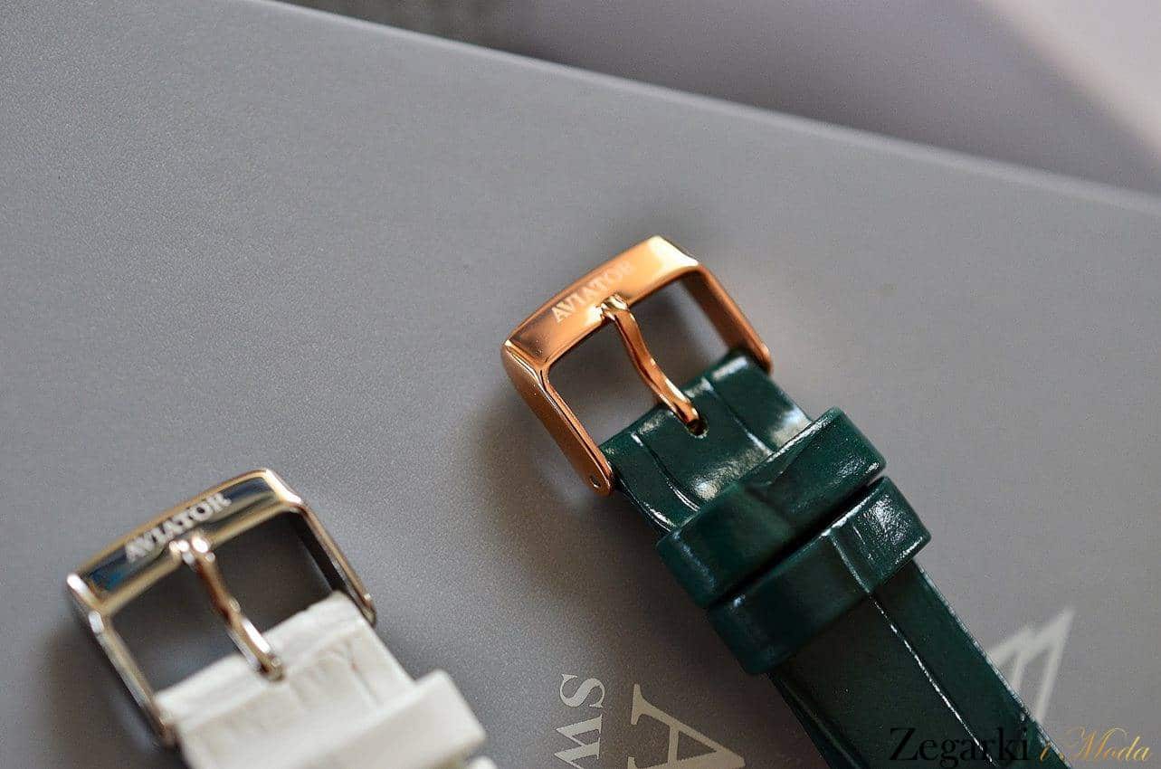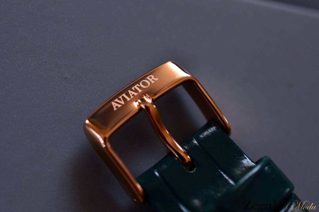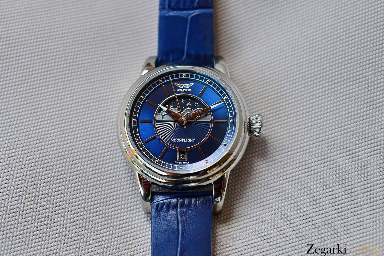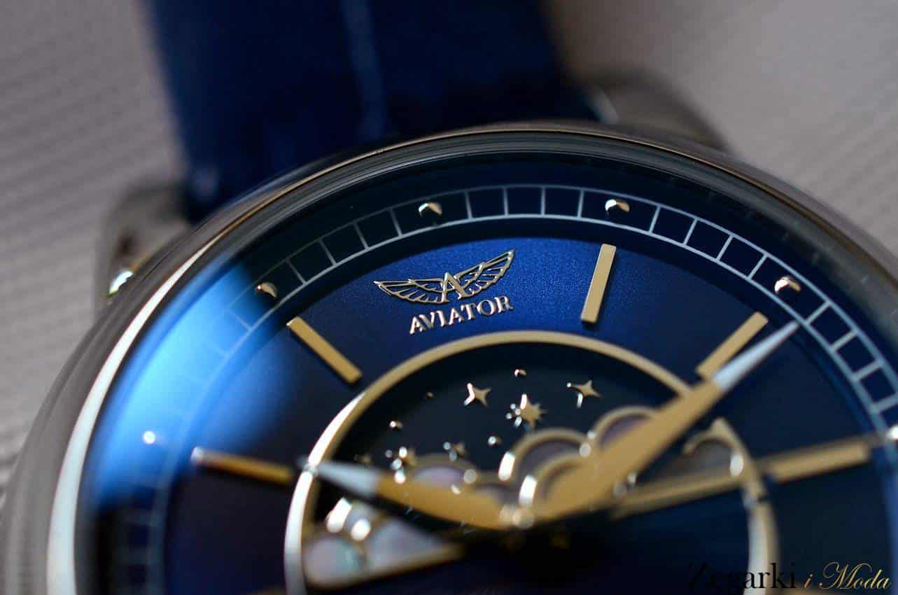 Oznaczenia godzin to podłużne indeksy. Na wysokości godziny 12 projektanci umieścili logo i nazwę marki „Aviator”. Natomiast na wysokości godziny 6 zlokalizowali datownik wskazujący aktualny dzień miesiąca. Datownik rozdziela znak „swiss made”. To potwierdzenie szwajcarskiej, wysokiej jakości. Warto to podkreślić, bo wielu producentów zegarków fashion nie może się tym znakiem poszczycić.