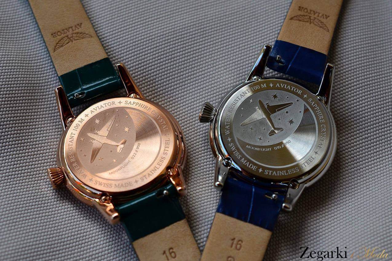 Zegarki z kolekcji Aviator Douglas MoonFlight mają dwa kolory kopert – srebrną i złotą.