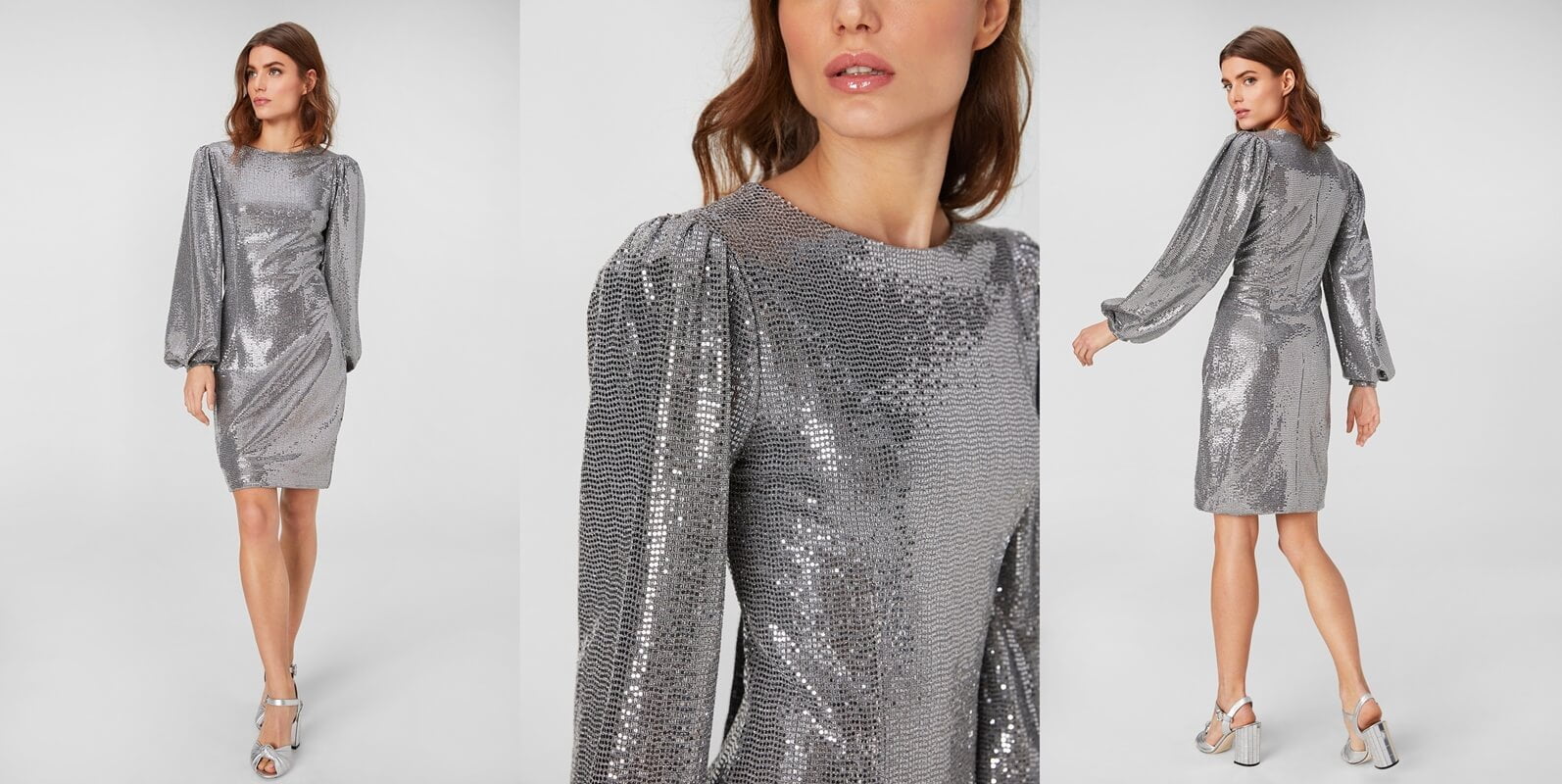 Dość swobodnym nawiązaniem do tego trendu będzie kreacja sieci H&M. Sukienka z grubego brokatu o długości midi. Odcięta pod linią biustu, doskonale sprawdzi się dla dziewczyn o figurze jabłka. Całości dopełnia ozdobna kokarda na górze sukienki. Cena: 699 zł