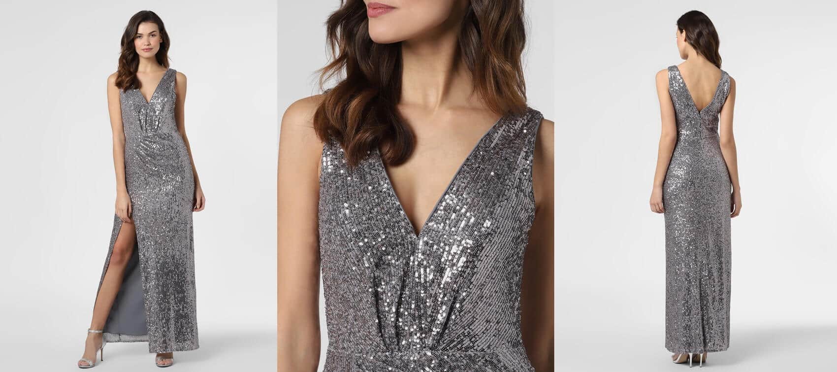 Następną błyszczącym wyborem jest sukienka wieczorowa od Marie Lund. Dopasowany krój, piękne marszczenie w okolicy talii, długość maxi i zmysłowe rozcięcie. Doskonale podkreśli kobiece kształty klepsydry. Cena: 799,95 zł