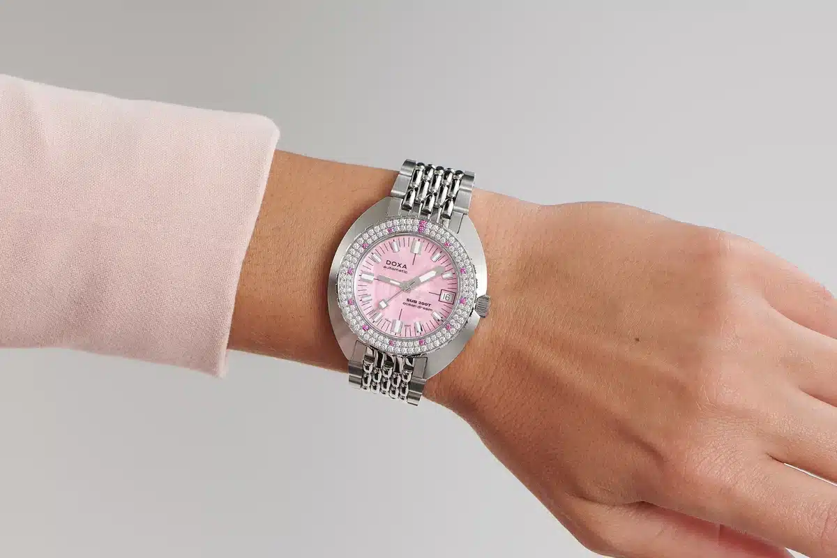 Mateusz: Zgadzam się. Doxa zawsze miała surowy, narzędziowy styl. A tutaj – połączenie z perłową tarczą i diamentami wygląda zaskakująco dobrze.