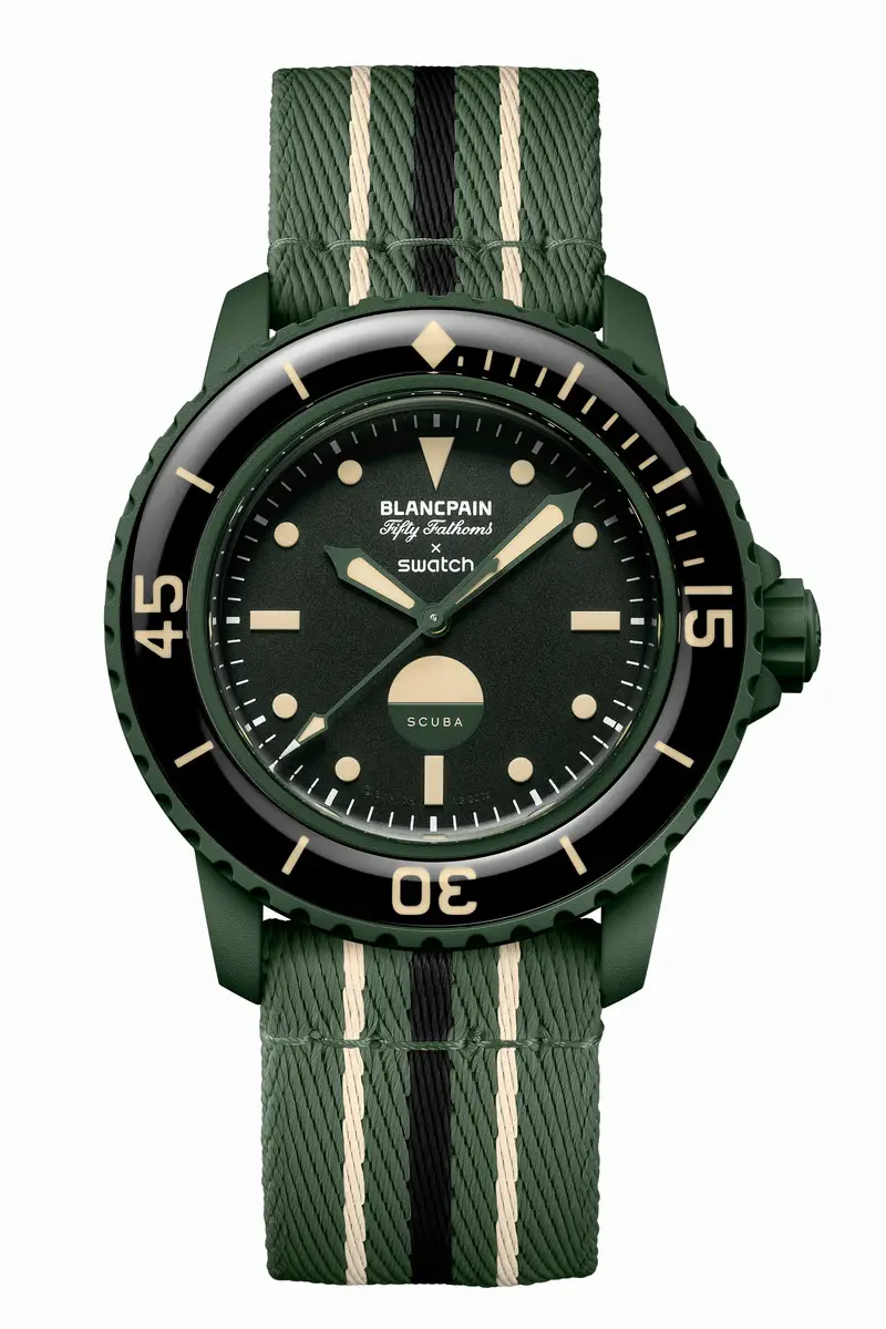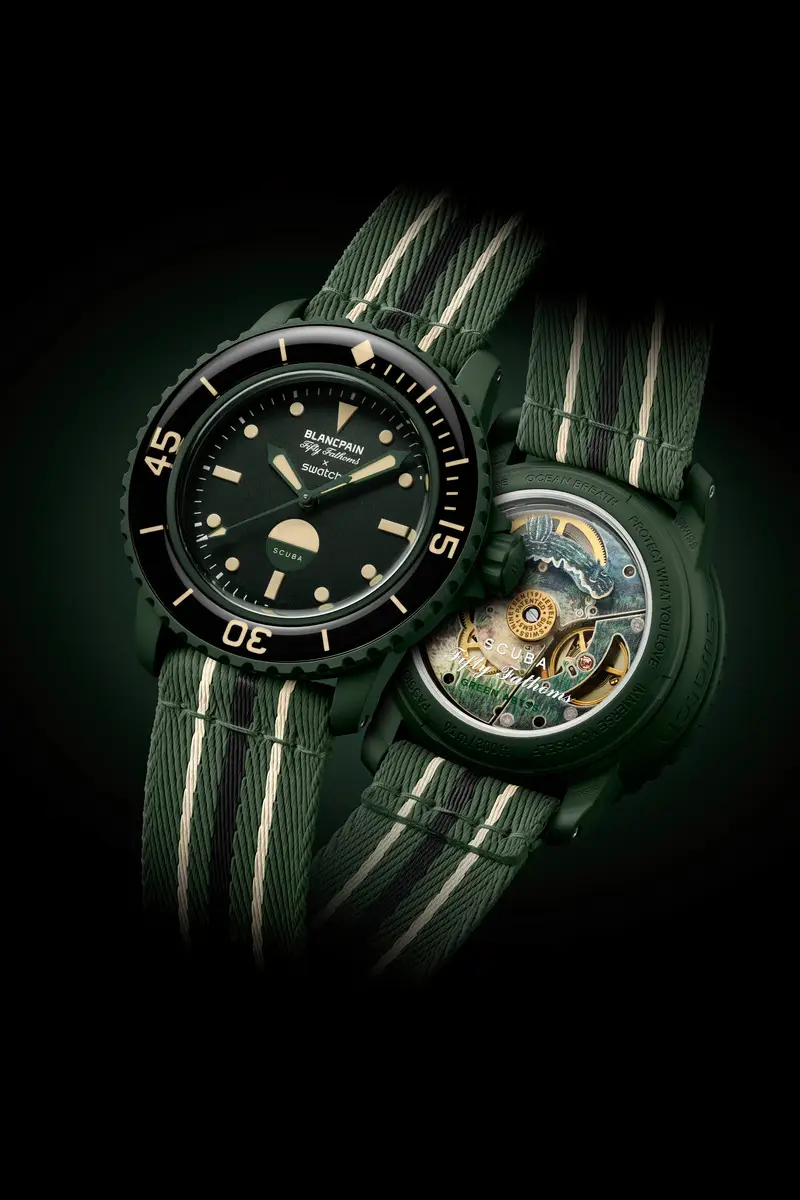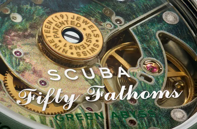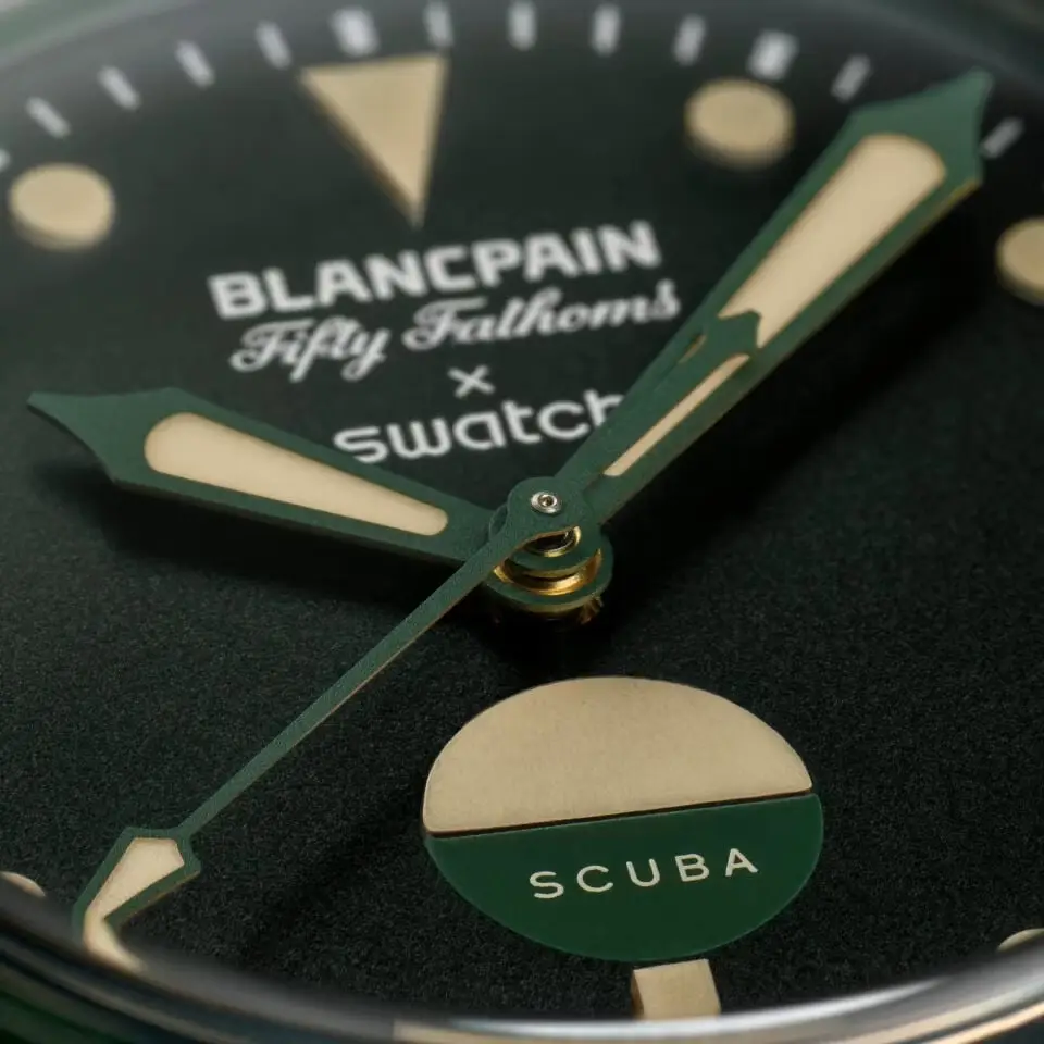 Na tarczy GREEN ABYSS widnieje historyczne logo Blancpain – kolejny element ceniony przez kolekcjonerów. Ponadto na tarczy oraz koronce znajduje się logo nawiązujące do współpracy pomiędzy Blancpain i Swatch. Zegarek ma też dwuczęściowy pasek w stylu NATO i profil koperty nawiązujący do kultowej sylwetki Fifty Fathoms, czym dowodzi trwałego dziedzictwa tego modelu.