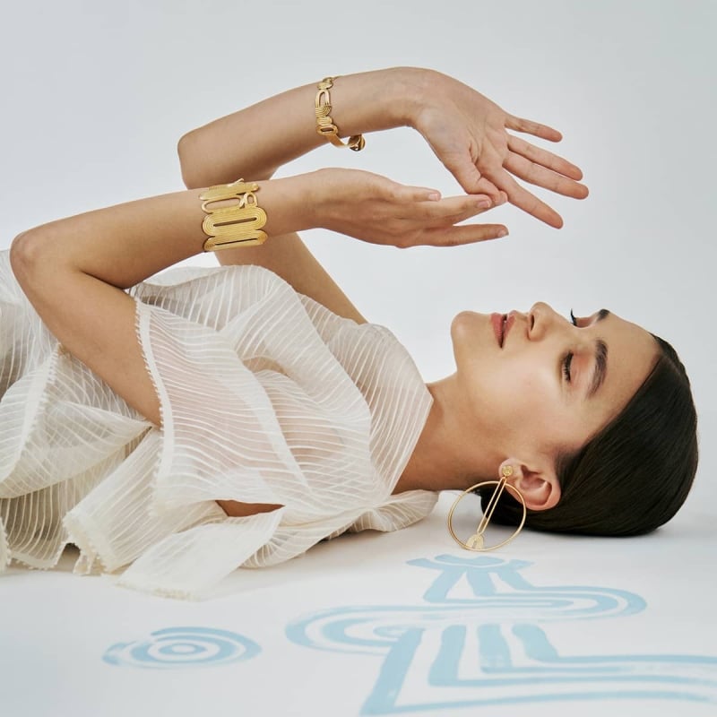 Motyw znajdziemy w pozłacanym pinie oraz w asymetrycznych kolczykach, sygnecie i naszyjniku, w których płynnie przenika się z pozostałymi żywiołami.