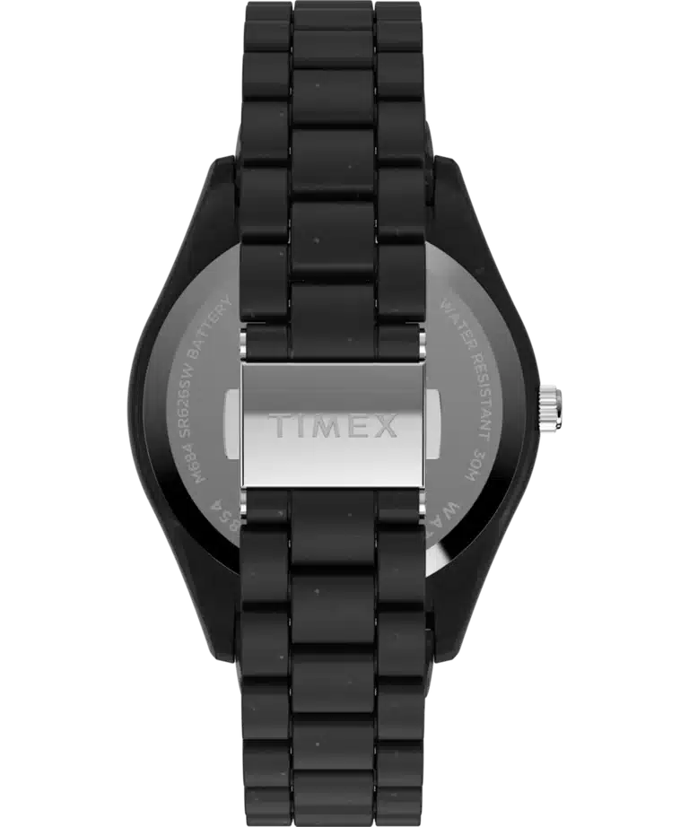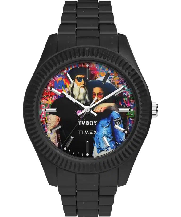 Drugi zegarek z kolekcji Timex x TVBOY to model Legacy Ocean, który stawia nie tylko na design, ale również na odpowiedzialność wobec środowiska. Jego 42-milimetrowa koperta oraz bransoleta zostały wykonane z przetworzonego plastiku oceanicznego, zebranego z wybrzeży we współpracy z organizacją #tide™. To materiał premium, powstały z troską o planetę, transportowany do Szwajcarii w sposób neutralny węglowo.